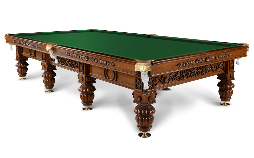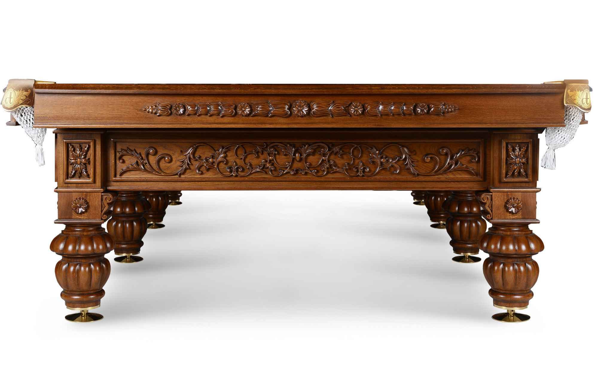 «Ампир» - это стол высочайшего уровня по всем своим игровым характеристикам, внутреннему наполнению и внешнему образу, пронизанном особым духом классики и подчеркнутой роскоши. Он сосредоточил в себе лучшие конструктивные характеристики, передовые технологии изготовления, эксклюзивность комплектующих, ценность материалов и представляет собой высокую категорию игровых качеств. Дизайн модели «Ампир» передает точную стилистику одноименного стиля. Ампир, как стиль, зародился в искусстве в начале XIX века, во времена империи Наполеона, из Франции стиль быстро распространился по всей Европе и за ее пределы. Роскошь в стиле ампир всегда выступает на первый план. Этот бильярдный стол придется по вкусу поклонникам изящества и элегантной роскоши. Бильярд с точеными ногами, ручной резьбой на лафете изготавливается из отборного ясеня и дуба мастерами Фабрики.