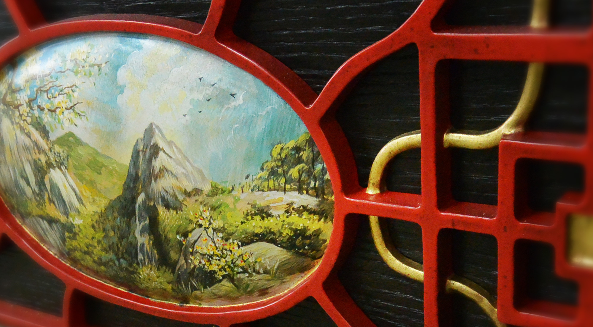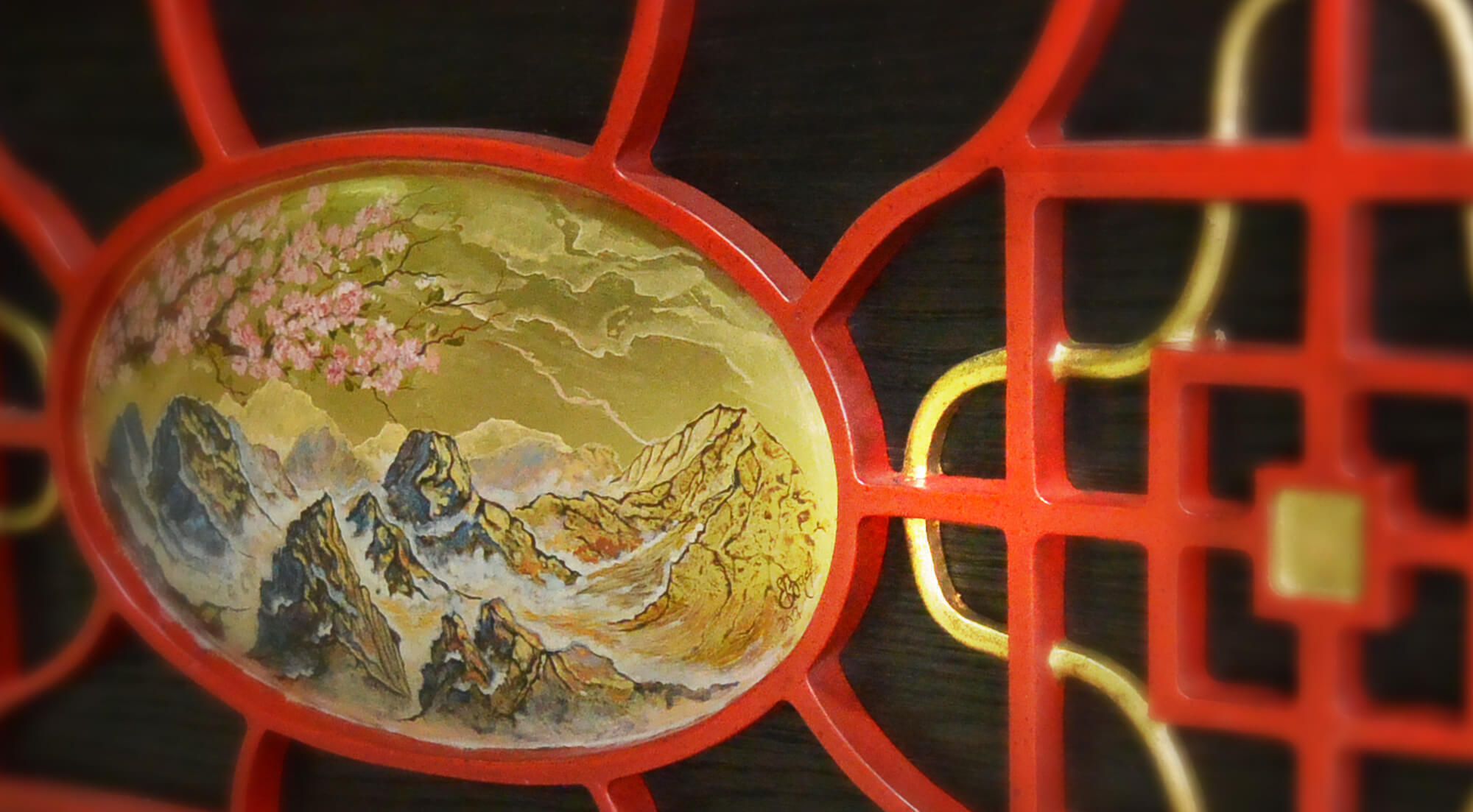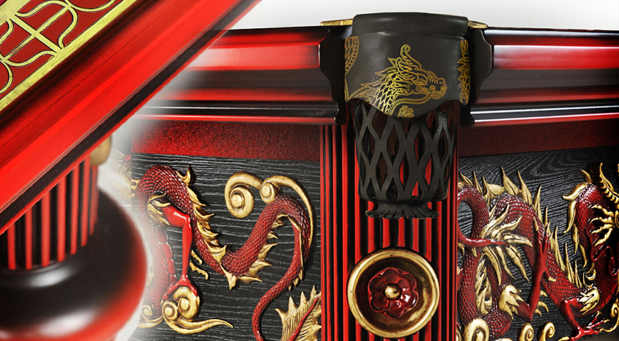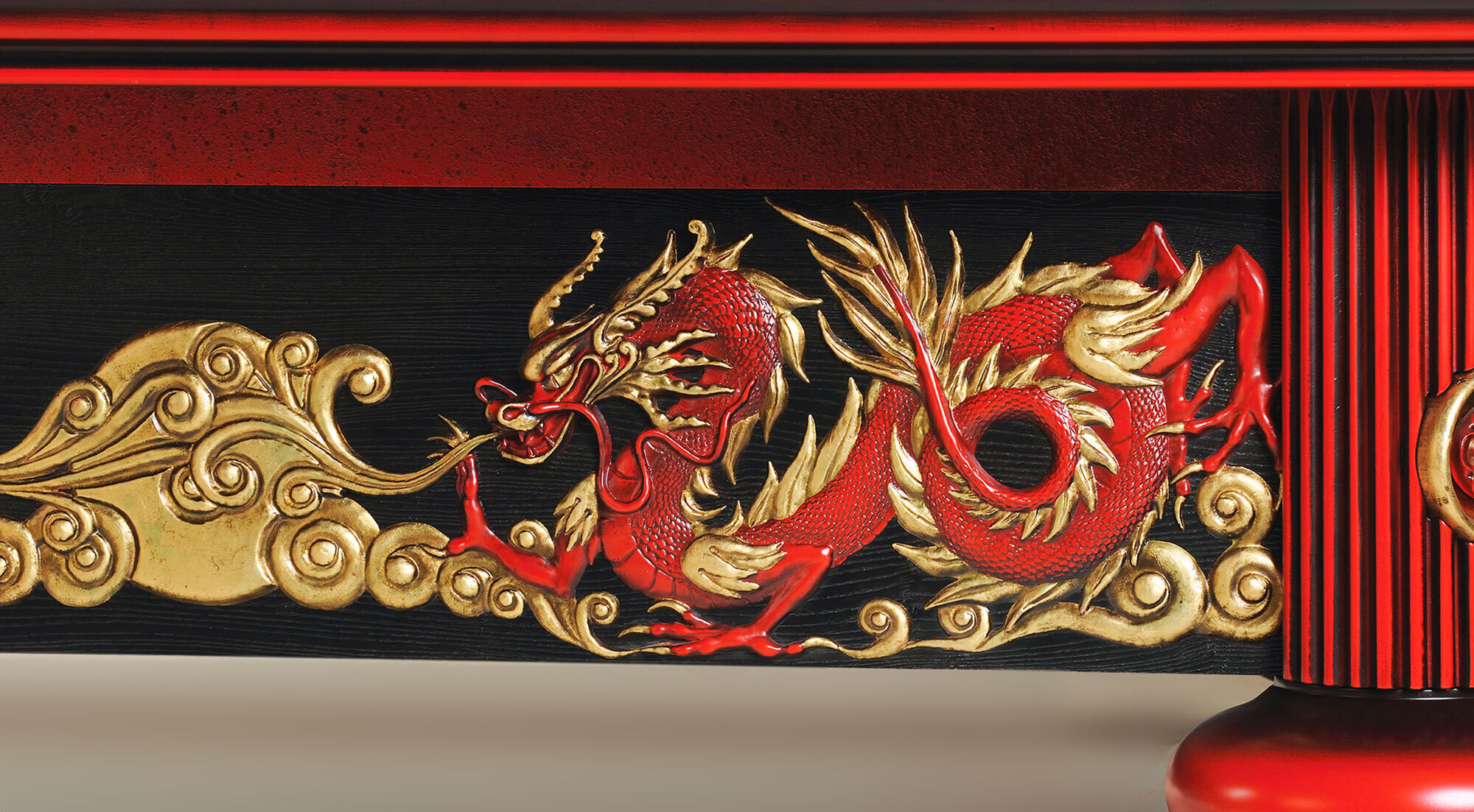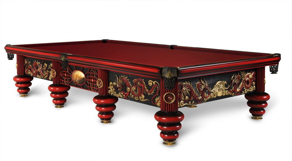 Китайский императорский стиль стал главным ориентиром при разработке образа стола. Лафет украшают золоченые барельефы драконов и декоративное панно традиционной китайской росписи - выполняется мастерами вручную специальными минеральными красками. Отделка стола «Дракон» подобрана с учетом традиций старинных технологий. Лаковая многослойность на бортах: 10 слоев лака применена для достижения глубины, насыщенности, многогранности цвета. Брашированное дерево: дерево с душой на лафете, для дополнительного рельефа и графичности волокна. Конструкция стола «Дракон» вобрала в себя все лучшие технологические разработки Фабрики. Эксклюзивная металлическая несущая рама, интегрированная в основание стола, обеспечивает непревзойденную устойчивость и статичность всей конструкции стола. Система плавающих гаек в вертикальном креплении бортов идеальным образом крепит борт к плите, благодаря чему борт и плита становятся единым монолитом.