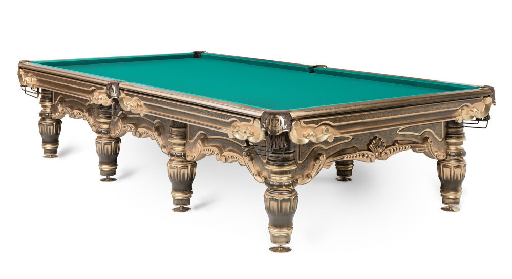 Бильярдный стол «Император Голд» поистине уникален. Натуральный массив клена, резные элементы, неповторимый дизайн лафета и ног. Шикарная отделка всей поверхности стола и аксессуаров золотой пастой и сусальным золотом в 23 карата, а также специальная технология искусственного старения древесины делают стол «Император Голд» настоящим произведением искусства.