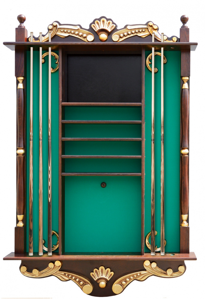 Модель настенная, предназначена для 6 киев, позволяет разместить треугольник, мелки, а также бильярдные шары. Материал массив ясеня / клен. Есть возможность выбрать цвет из палитры Фабрики «Старт»