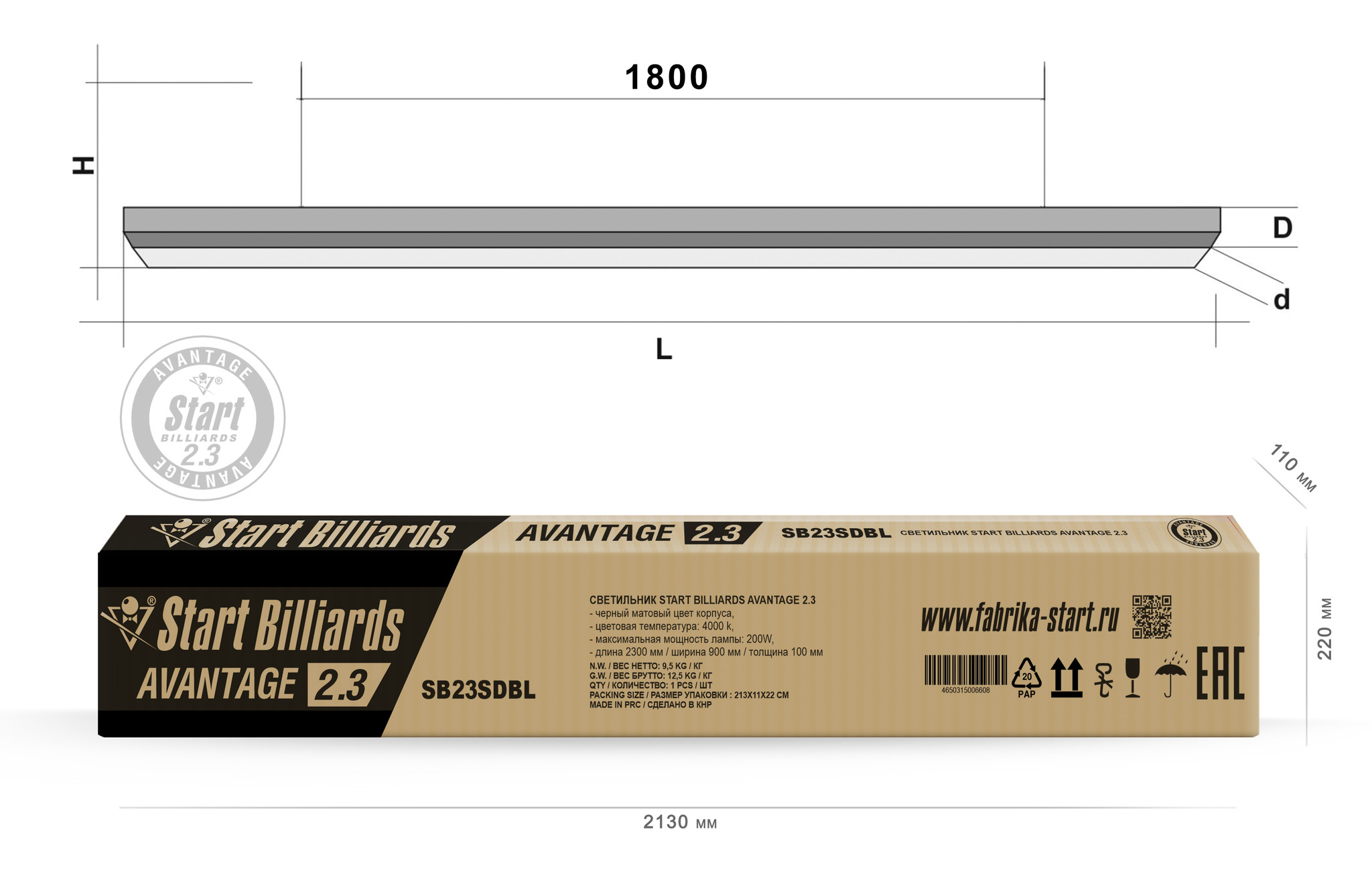 Световой поток модели соответствует и превышает требования МКП к осветительным приборам для проведения чемпионатов и турниров по бильярдному спорту - 1500 Lux в центре игрового поля при расстоянии 1200 мм от лампы до стола. Преобразите пространство вашей бильярдной комнаты с помощью светильника Start Billiards Avantage 2.3 — эталона современного подхода к освещению бильярдного стола. Плоский LED-светильник сочетает в себе лаконичный дизайн, передовые технологии и высочайшую функциональность, создавая идеальные условия для сосредоточенной и азартной игры. Светильник предназначен для полноценного освещения бильярдных столов размером 9 и 10 футов, что делает его идеальным выбором как для домашних бильярдных, так и для профессиональных клубов. Строгий и минималистичный дизайн с толщиной всего 100 мм легко впишется в любой современный интерьер — от классического кабинета до лофта. Лаконичные линии и плоская форма делают светильник не просто источником света, а стильным элементом декора. Продуманная конструкция и рассеиватель создают комфортное и равномерное освещение без слепящего эффекта. Равномерный и яркий световой поток, лишенный теней и бликов, полностью покрывает игровую поверхность стола. Специально подобранная нейтрально-белая цветовая температура #40;4000K#41; обеспечивает максимальную контрастность и цветопередачу. Современные светодиодные технологии гарантируют существенную экономию электроэнергии при одновременном сохранении высокой яркости. Avantage 2.3 — это выгодное и экологичное решение на долгие годы. Start Billiards Avantage 2.3 — это не просто лампа, это финальный штрих, который подчеркивает статус бильярдной зоны и заботится о качестве игры. Выбирайте совершенство. Выбирайте современный стиль. Условные схематические обозначения: L — длина лампы / 2300 мм d — ширина лампы / 900 мм D — толщина лампы / 100 мм