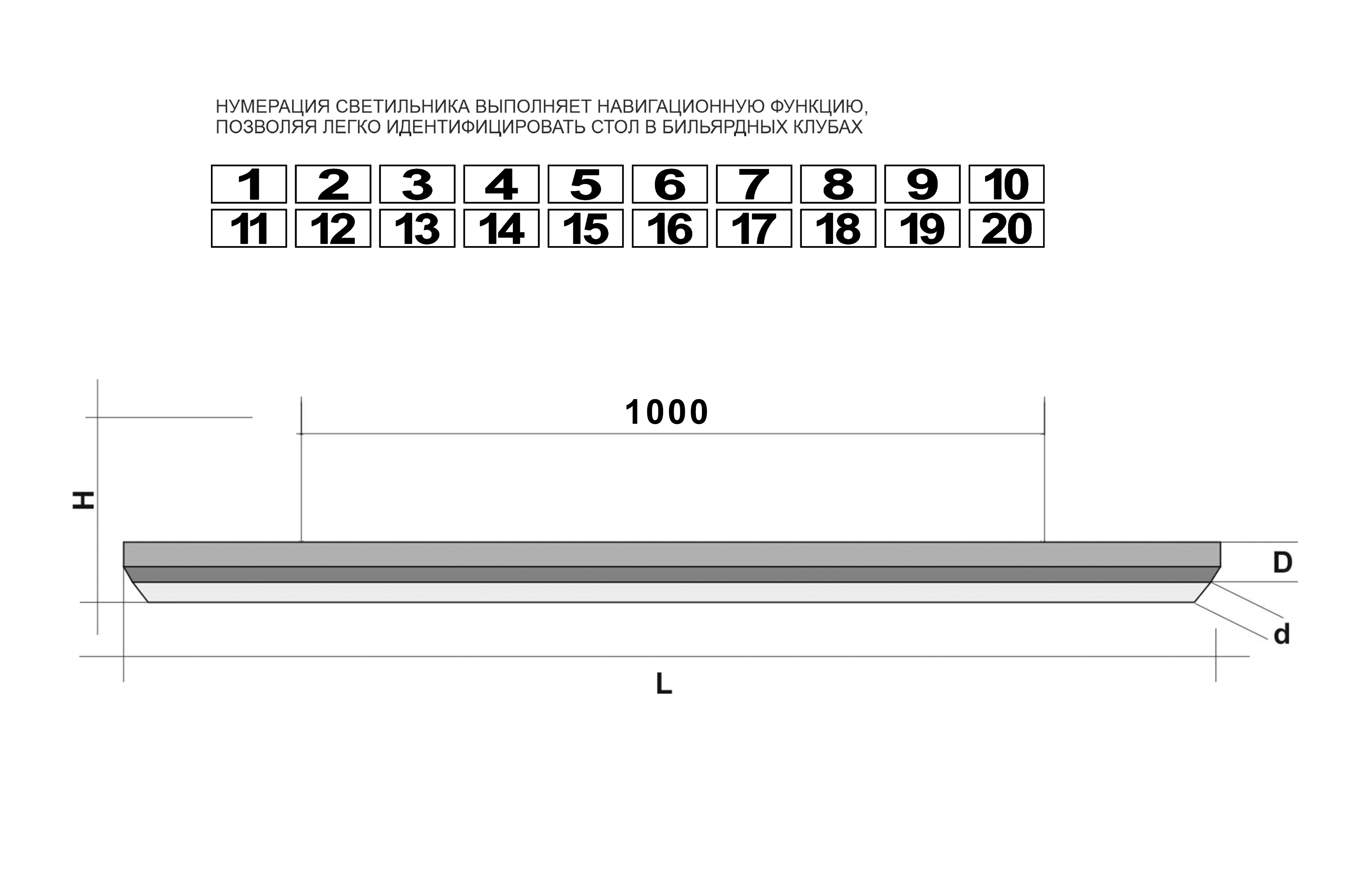 В комплекте предусмотрена номерная табличка, интегрированная в узкий торец лампы — важный функциональный элемент для коммерческих клубов. Это решение выполняет навигационную функцию, позволяя легко идентифицировать стол издалека, что особенно удобно для бильярдных клубов.