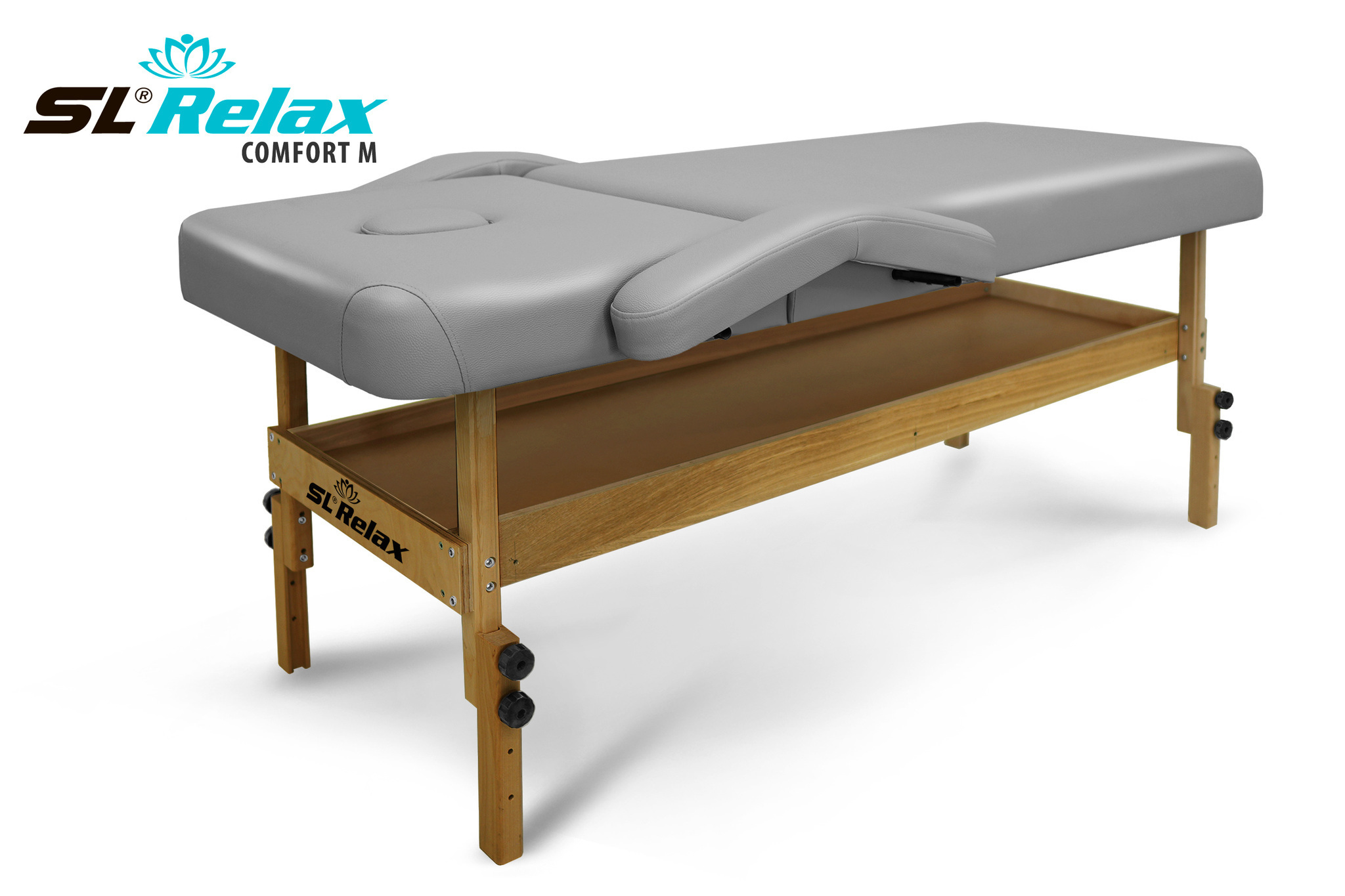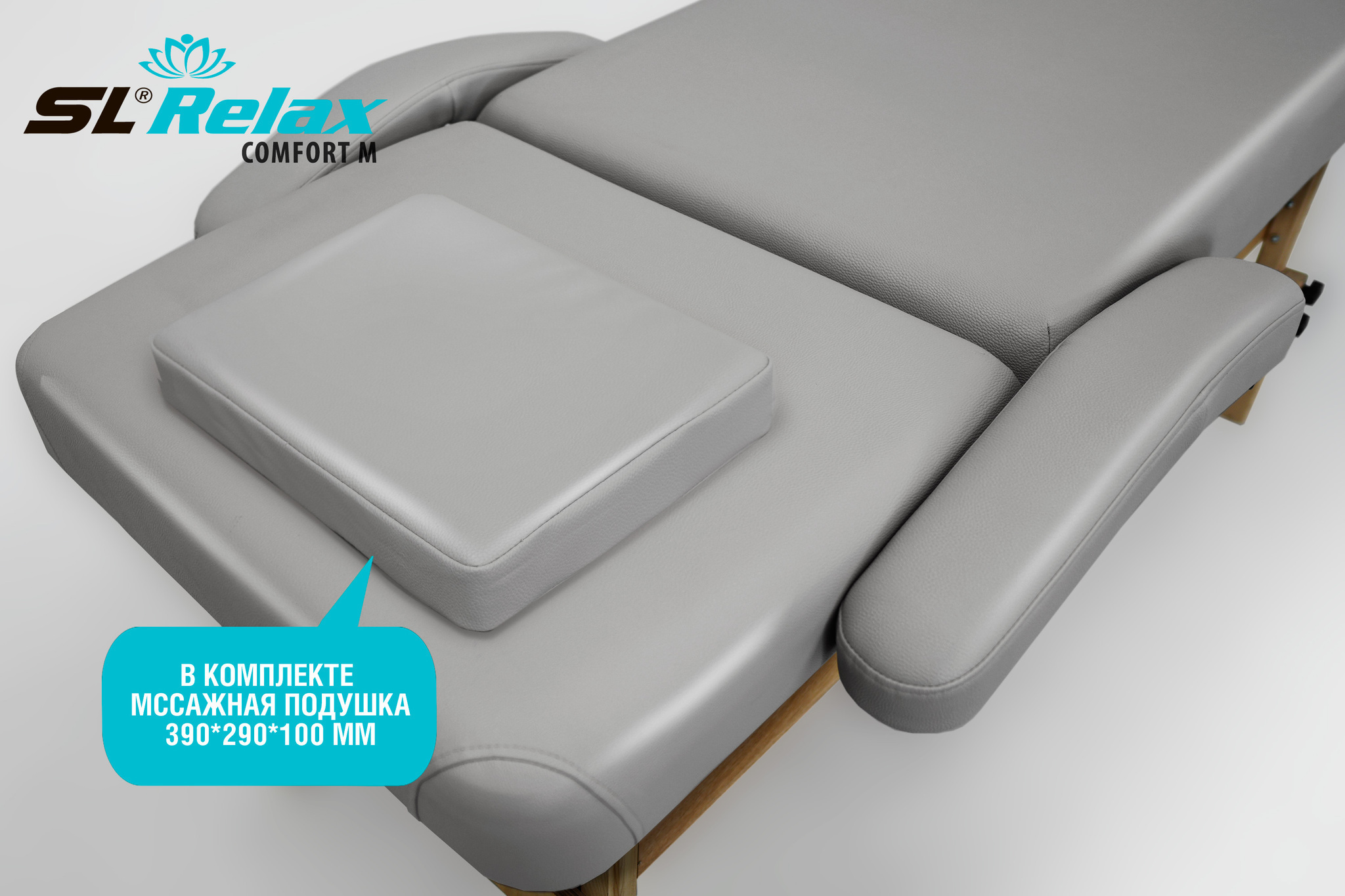Профессиональный массажный стол Relax Comfort M создан на базе успешной модели Relax Comfort с улучшенной конструкцией и дополнительными элементами комфорта в виде подлокотников и подушки. Эта модель идеально подходит для профессионального массажа, обеспечивая максимальное удобство как для клиента, так и для мастера.nbsp;nbsp; Улучшенная конструкция модели подарит максимальный комфорт во время массажа спины, шеи и ног. Стол оснащен мягкими подлокотниками и подушкой для дополнительного удобства клиента. Регулируемый подголовник с механическим фиксатором позволяет настроить оптимальный наклон, а отверстие для лица обеспечит удобное положение головы при массаже спины и шеи. Устойчивые ножки и усиленная конструкция с функциональной стеллажной полкой для хранения аксессуаров выполнены из дерева повышенной прочности. Удобная полка позволит мастеру расположить рабочие принадлежности, такие как валик для массажа, полотенца, масла и прочее. Прочный деревянный каркас гарантирует долговечность и устойчивость.nbsp;nbsp;Обивка выполнена из влагостойкой PU кожи, благодаря чему поверхность стола можно легко продезинфицировать или очистить в случае появления загрязнений, сохраняя безупречный вид даже при интенсивном использовании.nbsp;nbsp;Для удаления загрязнений достаточно протереть поверхность стола мягкой влажной тряпочкой из микрофибры. Relax Comfort M – это усовершенствованная версия проверенной модели, которая удовлетворит потребности даже самых взыскательных специалистов и их клиентов.nbsp;nbsp; *Обратите внимание: оттенок обивки на фото может незначительно отличаться от реального.*