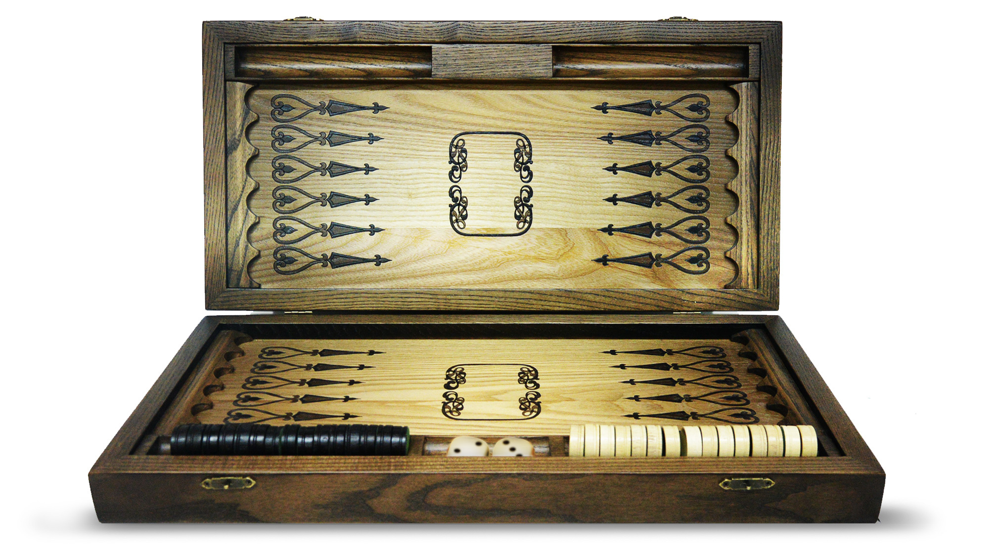 15 светлых фишек, 15 тёмных фишек, 2 кубика