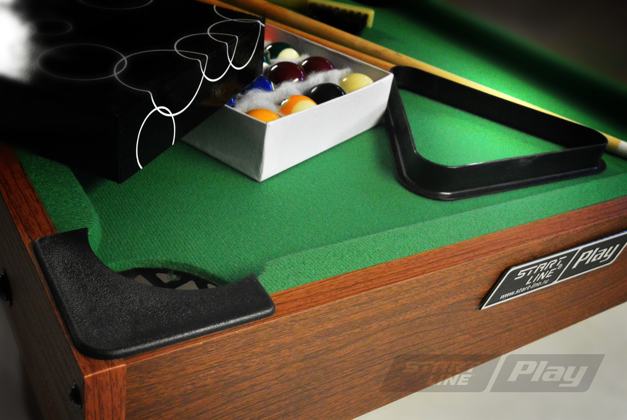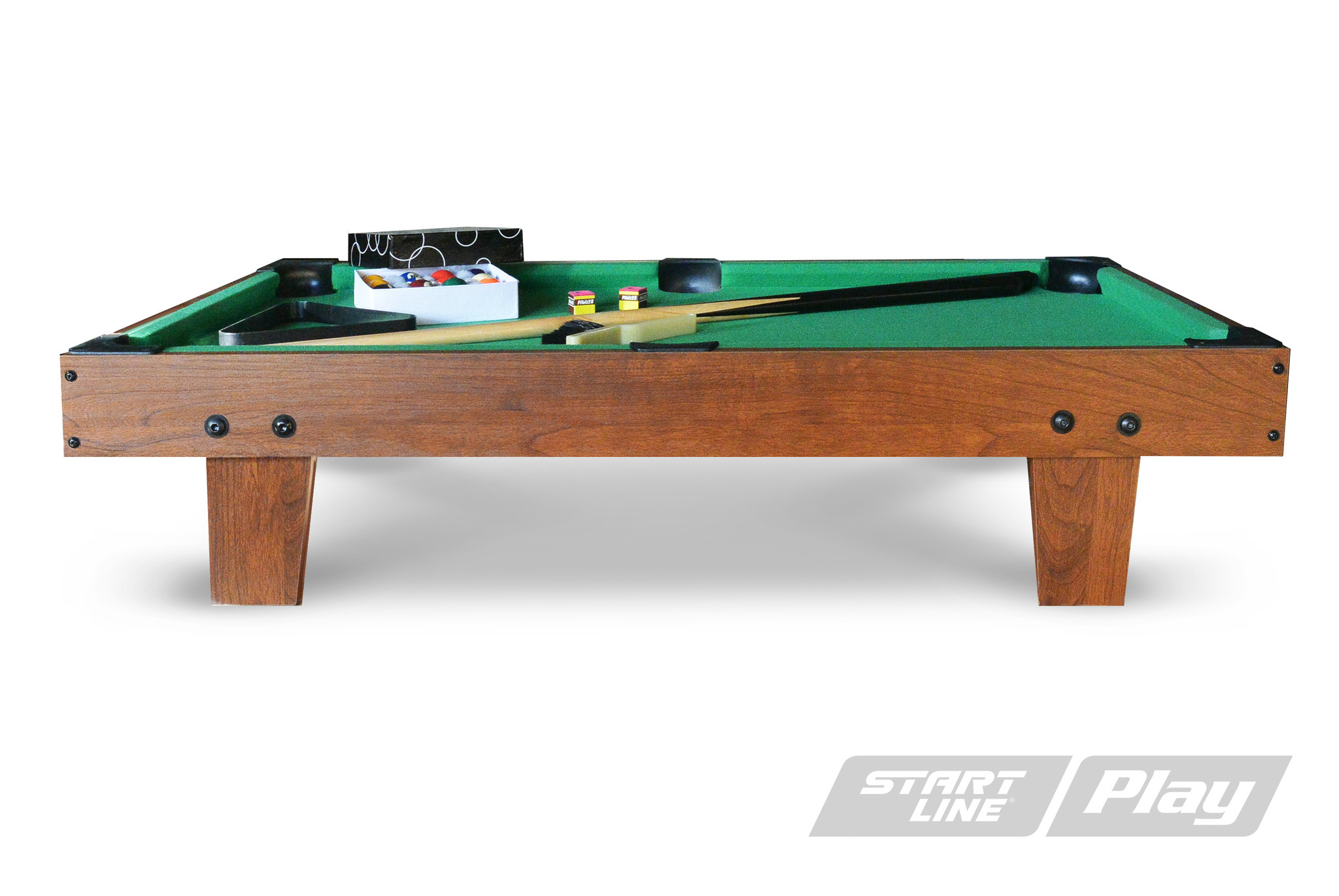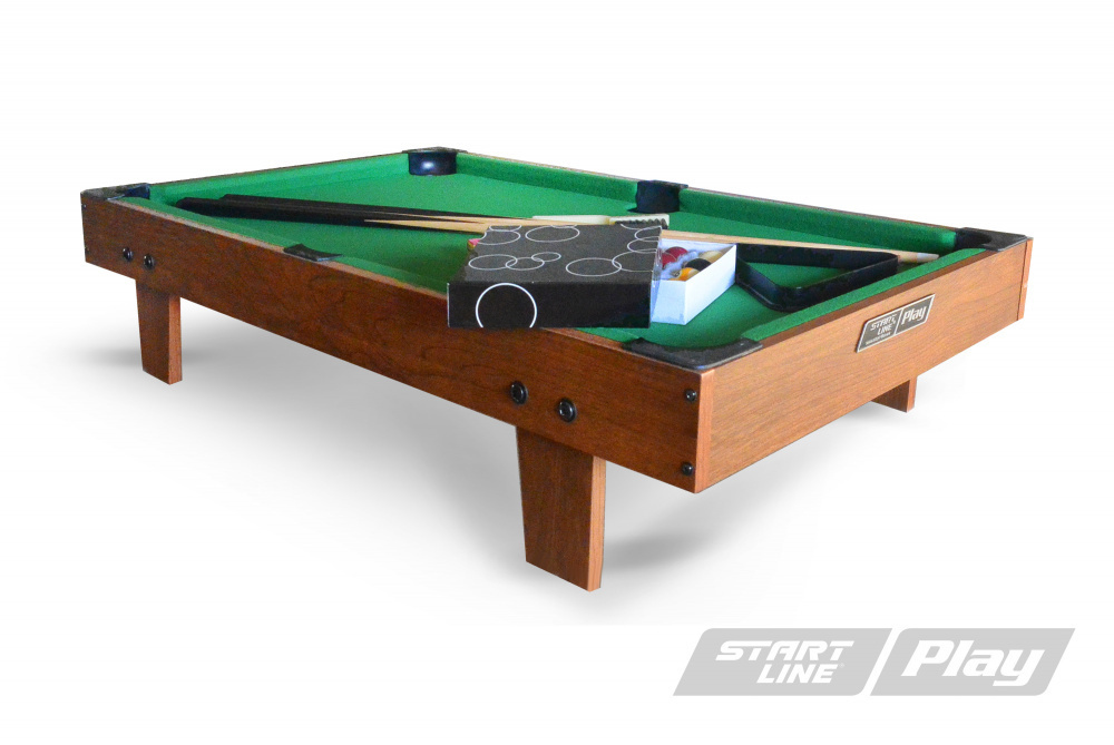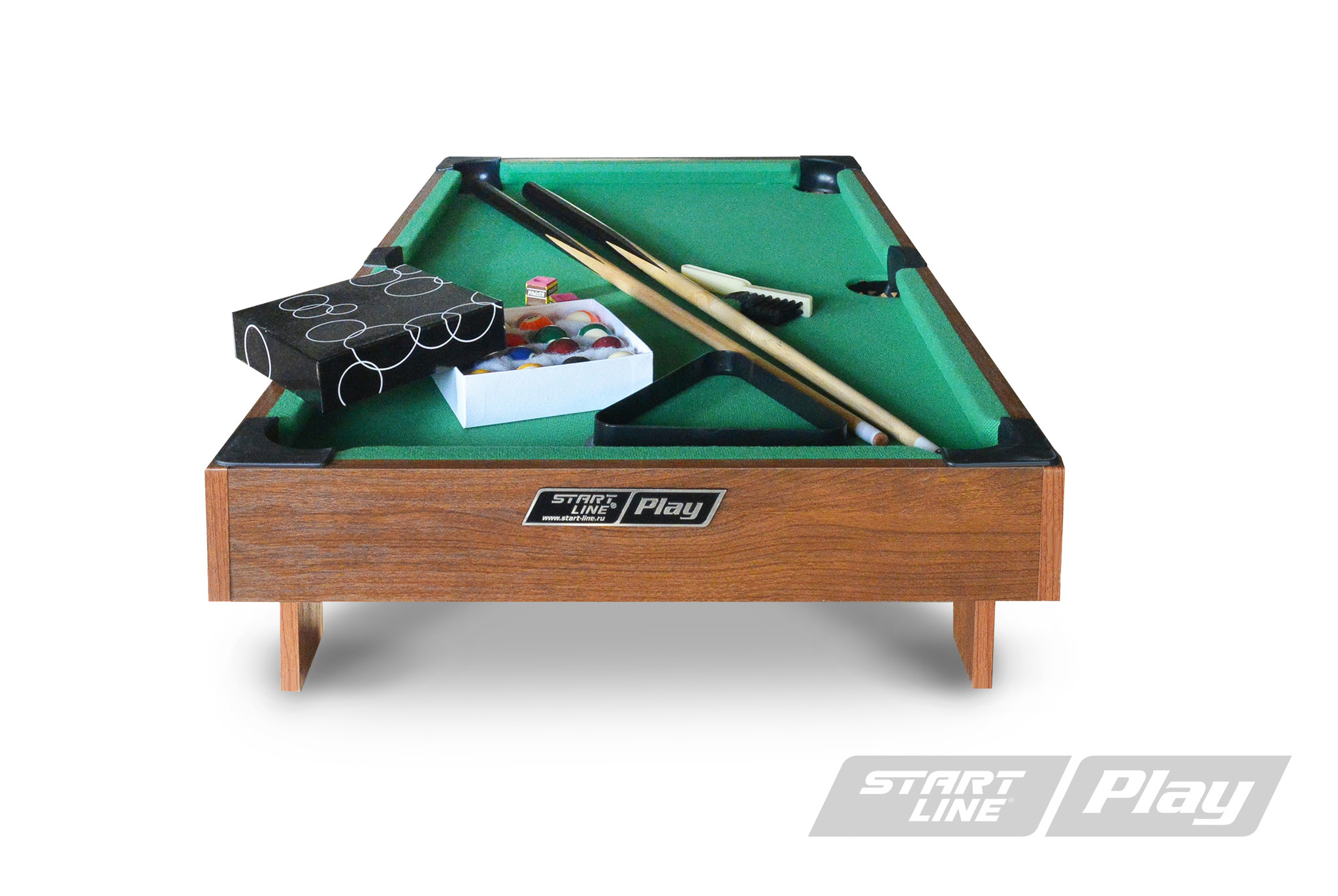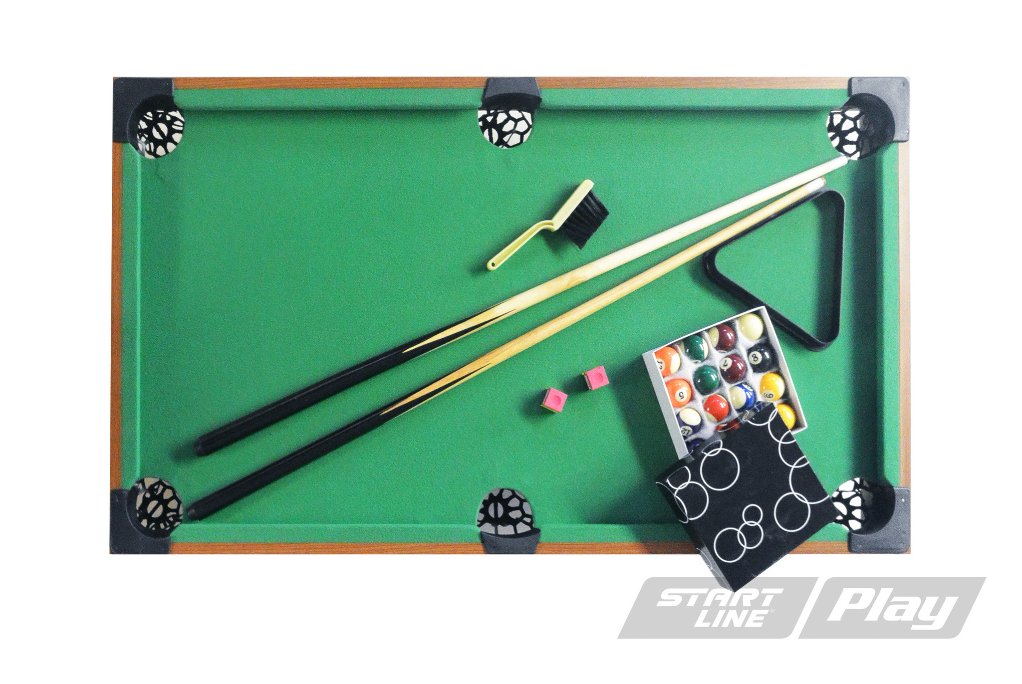 Настольный игровой стол для бильярда Start Line Play имеет универсальный дизайн и качественную отделку. Размеры стола #40;91*50*20 см#41; позволяют устанавливать его на обычный рабочий стол. В комплект входят: 1 набор шаров, 2 кия, 2 мела, 1 треугольник.