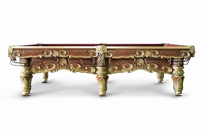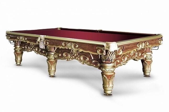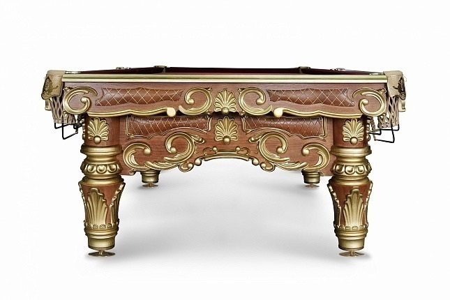 Бильярдный стол «Ренессанс-Лайт Голд» — создан для роскошных и пышных интерьеров. Декор стола наполнен духом эпохи Ренессанса. Выразительная выкраска стола выполняется вручную, в авторской технике с помощью нанесения золотой потали и золочения сусальным золотом.