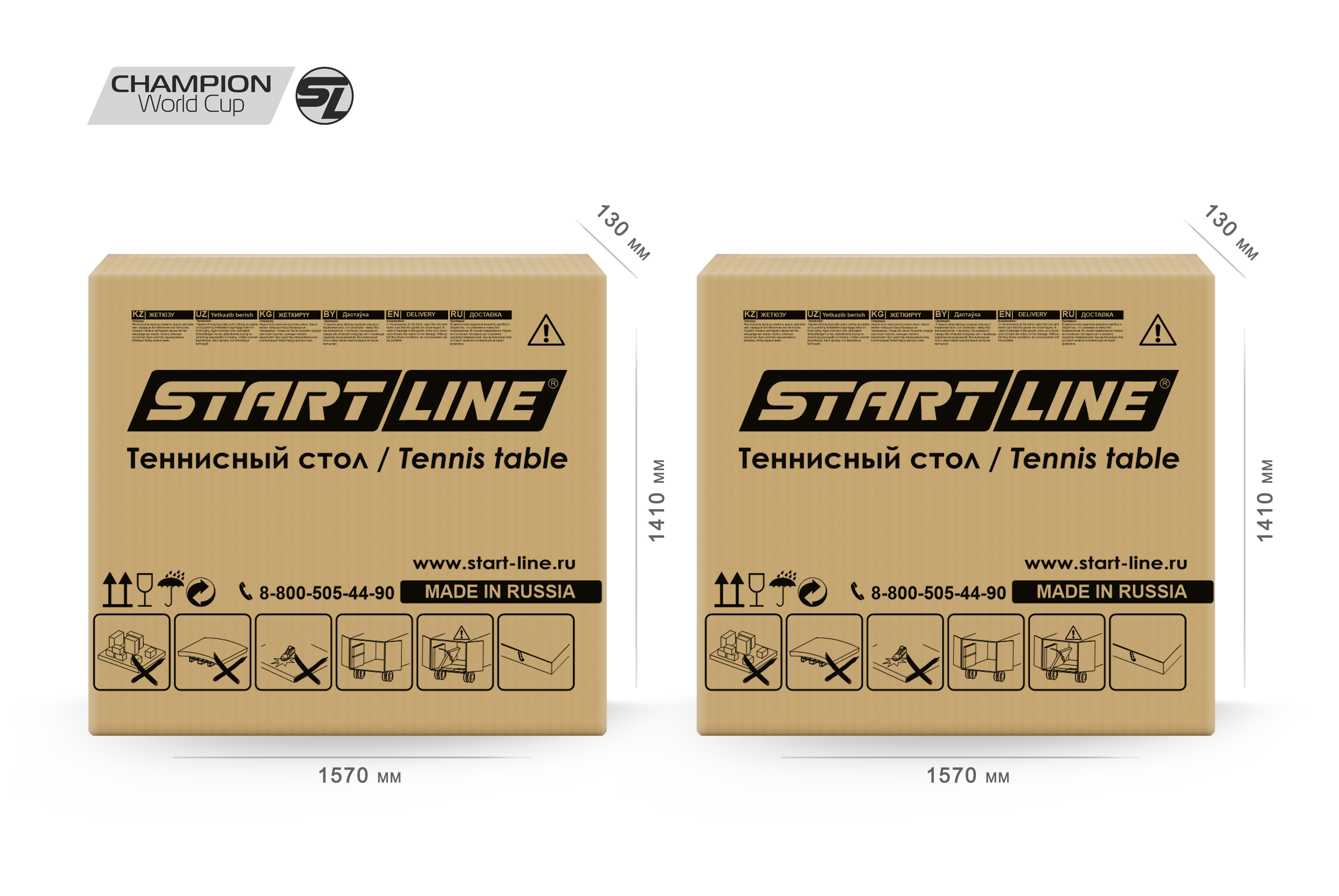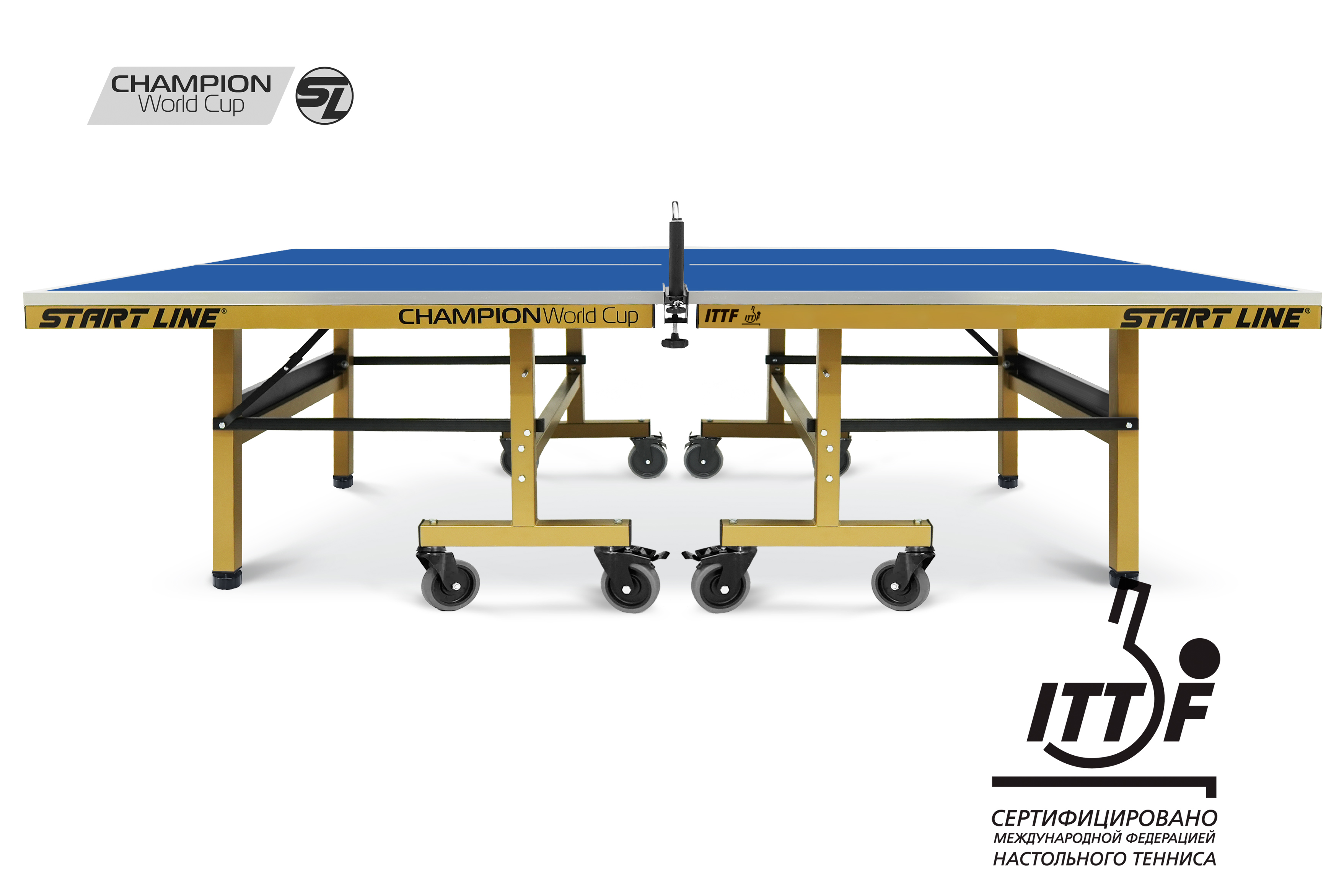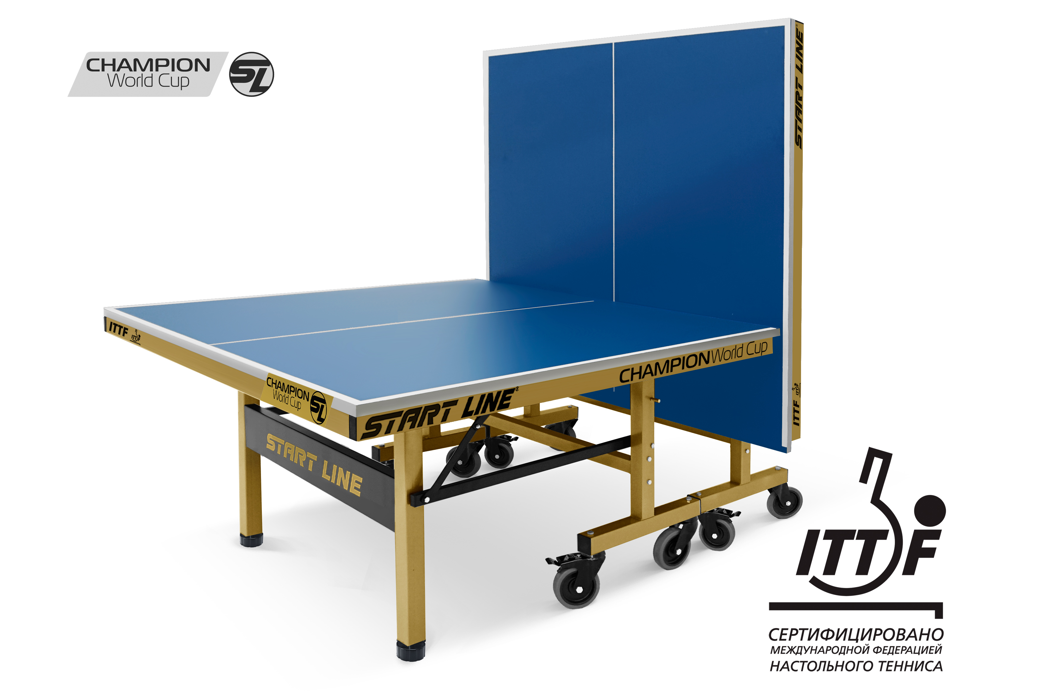Теннисный стол Champion World Cup — это результат симбиоза многолетнего опыта проведения профессиональных спортивных турниров и технологий передового производства. Теннисный стол Champion World Cup — новое прочтение стола Champion, который сертифицирован ITTF (Международной федерацией настольного тенниса), что подтверждает его соответствие стандартам для проведения профессиональных соревнований. Champion World Cup — это первый в России и странах СНГ стол, спроектированный для комплектации спортивных клубов и проведения профессиональных чемпионатов. Рекомендации топ-спортсменов, учтенные при разработке, гарантируют эргономику модели и игровые характеристики, соответствующие самым строгим мировым стандартам. Инженерам Start Line удалось достичь максимальных игровых показателей в условиях минимальной цены в сегменте. Это стало возможным благодаря локализации производства и стратегическому сотрудничеству с мировыми брендами, включая объединение усилий с ведущим производителем товаров для настольного тенниса — компанией Double Fish. Start Line предлагает две модификации стола на выбор: — Training — оптимальное решение для регулярных тренировок любого уровня подготовки и проведения профессиональных соревнований. — Competition — премиальная версия, представляющая собой настоящий шоу-стол, созданный для того, чтобы стать центральным объектом и эффектным украшением любого турнира! Размер стола в рабочем положении: 274 см в длину, 152,5 см в ширину и 76 см в высоту, что соответствует стандарту ITTF. Стол укомплектован столешницей из прочного материала МДФ толщиной 25 мм с двенадцати слойной антибликовой покраской, что гарантирует предсказуемый контроль над ударами и высокий отскок мяча. Уникальность финального этапа покраски заключается в нанесении лака через специальные вальцы, что создает эффект легкой шероховатости. Это инновационное решение напрямую влияет на сцепление мяча со столешницей, обеспечивая идеальный контроль без потери скорости отскока. Металлический кант 50x25 мм по всему периметру стола и кромка из ПВХ 0,45 мм обеспечивают устойчивость и долговечность стола даже в условиях интенсивной эксплуатации. Стол оснащен усиленной металлической рамой, которая обеспечивает исключительную жесткость конструкции и абсолютную устойчивость во время самых интенсивных розыгрышей. Обрезиненные колеса диаметром 125 мм гарантируют легкость перемещения. На каждой стороне стола установлено четыре колеса, два из которых оснащены тормозом, что гарантирует идеальную фиксацию и стабильность стола во время игры. Регулируемая высота боковых опор дает возможность адаптации стола к различным условиям, позволяя выставить идеальный уровень игрового поля даже на неровной поверхности. Сложить для хранения и разложить стол для игры без труда сможет один человек. Специальные фиксаторы позволяют надежно закрепить положение стола. Конструкцией предусмотрен режим одиночной игры PLAYBACK, который позволит тренироваться самостоятельно, отрабатывая навыки и точность ударов. Champion World Cup — это инвентарь наивысшего класса, который уже сегодня доступен для профессионального оснащения клубов и турнирных площадок. Start Line предлагает лучшую цену на рынке в своем сегменте, сохраняя высочайший уровень игровых характеристик. Более того, модель всегда в наличии на складе, что гарантирует бы