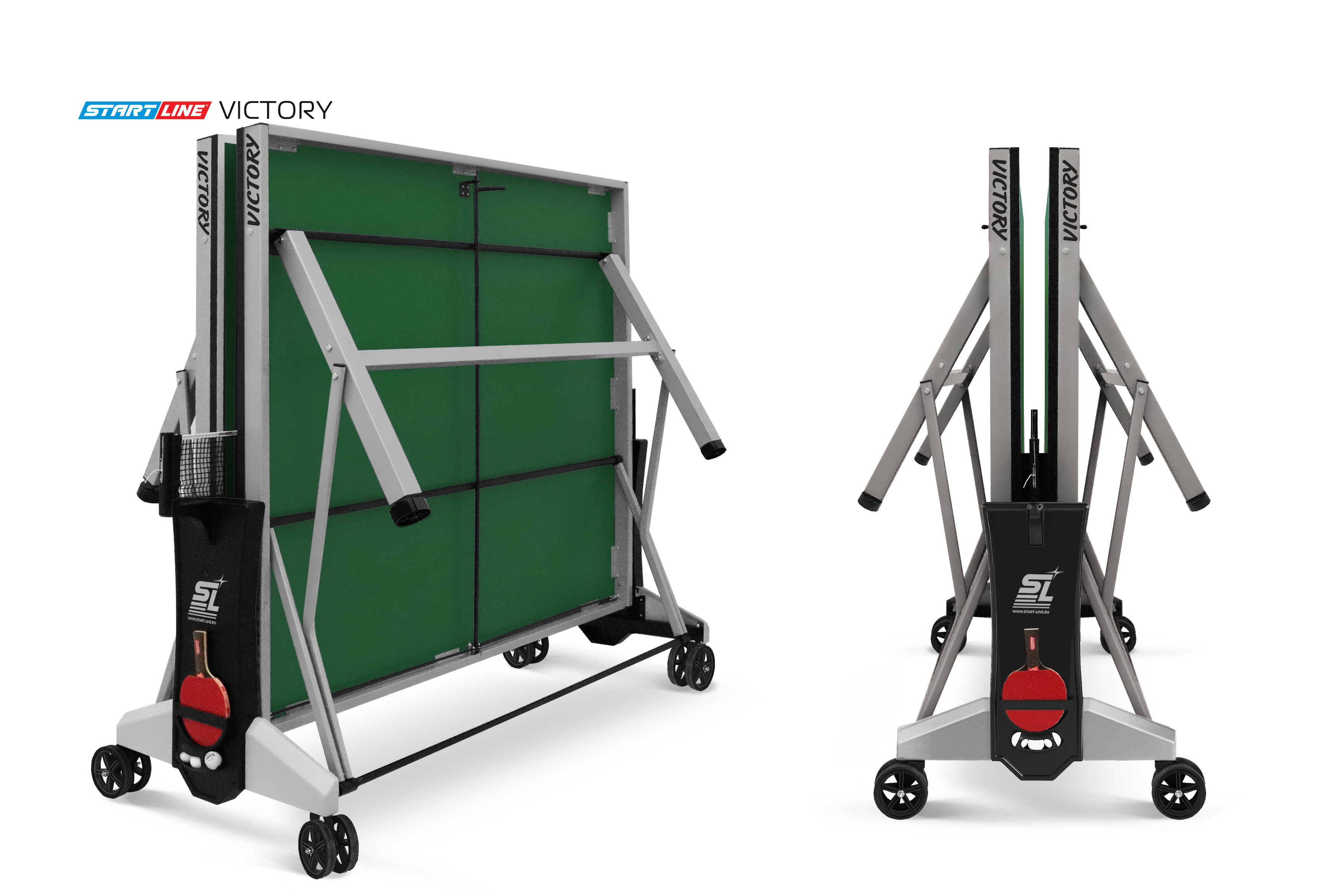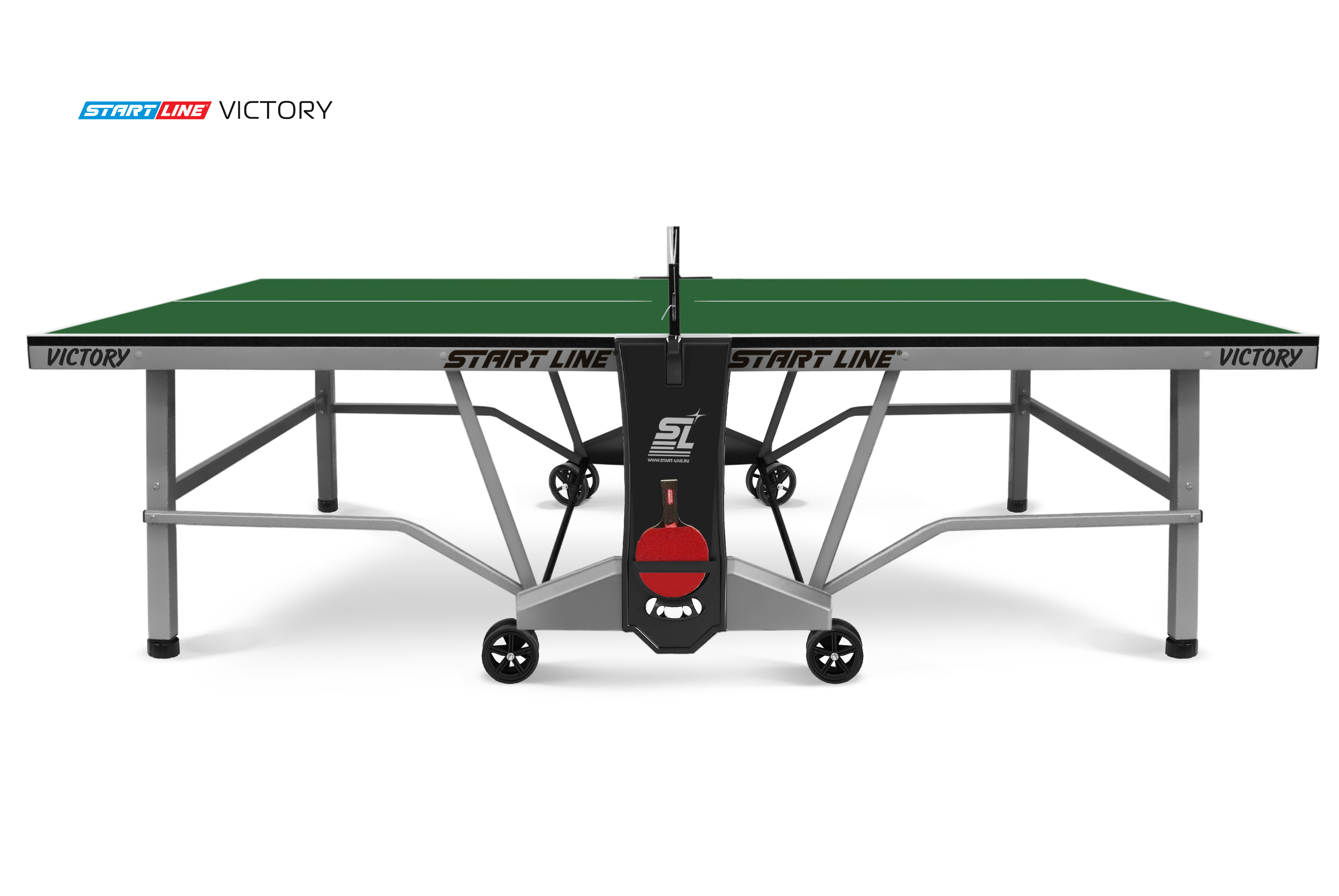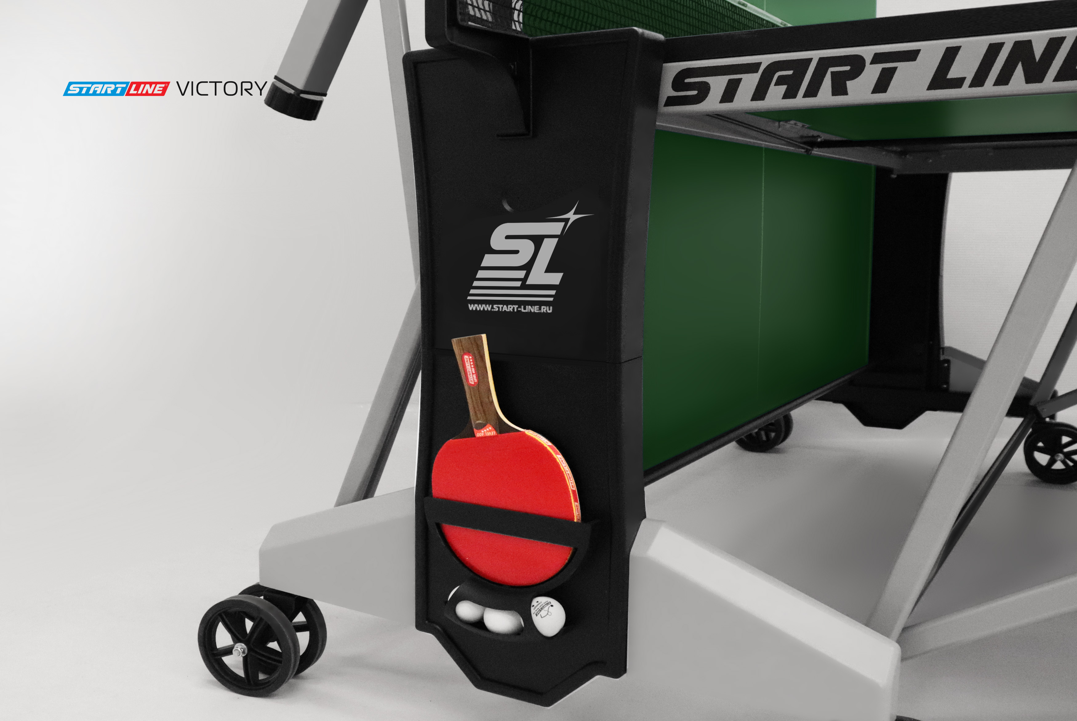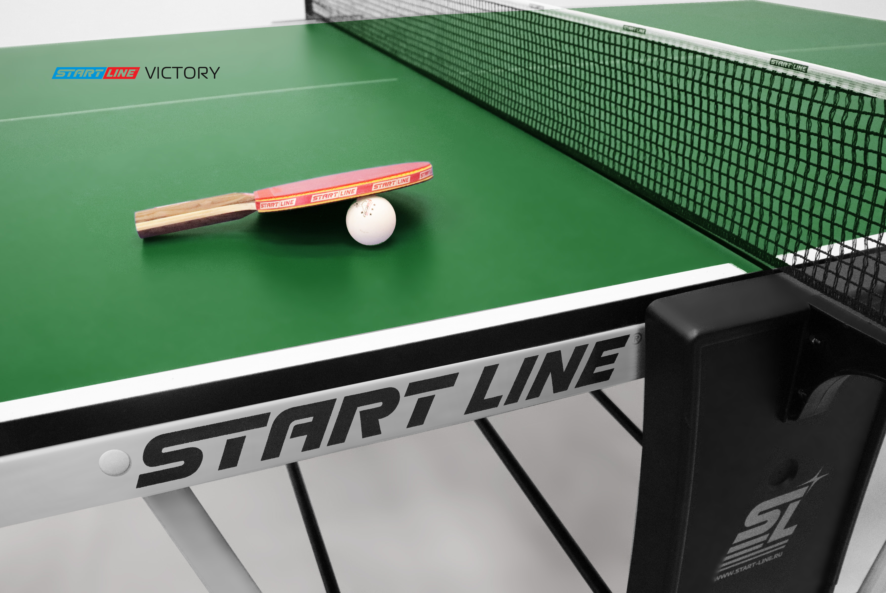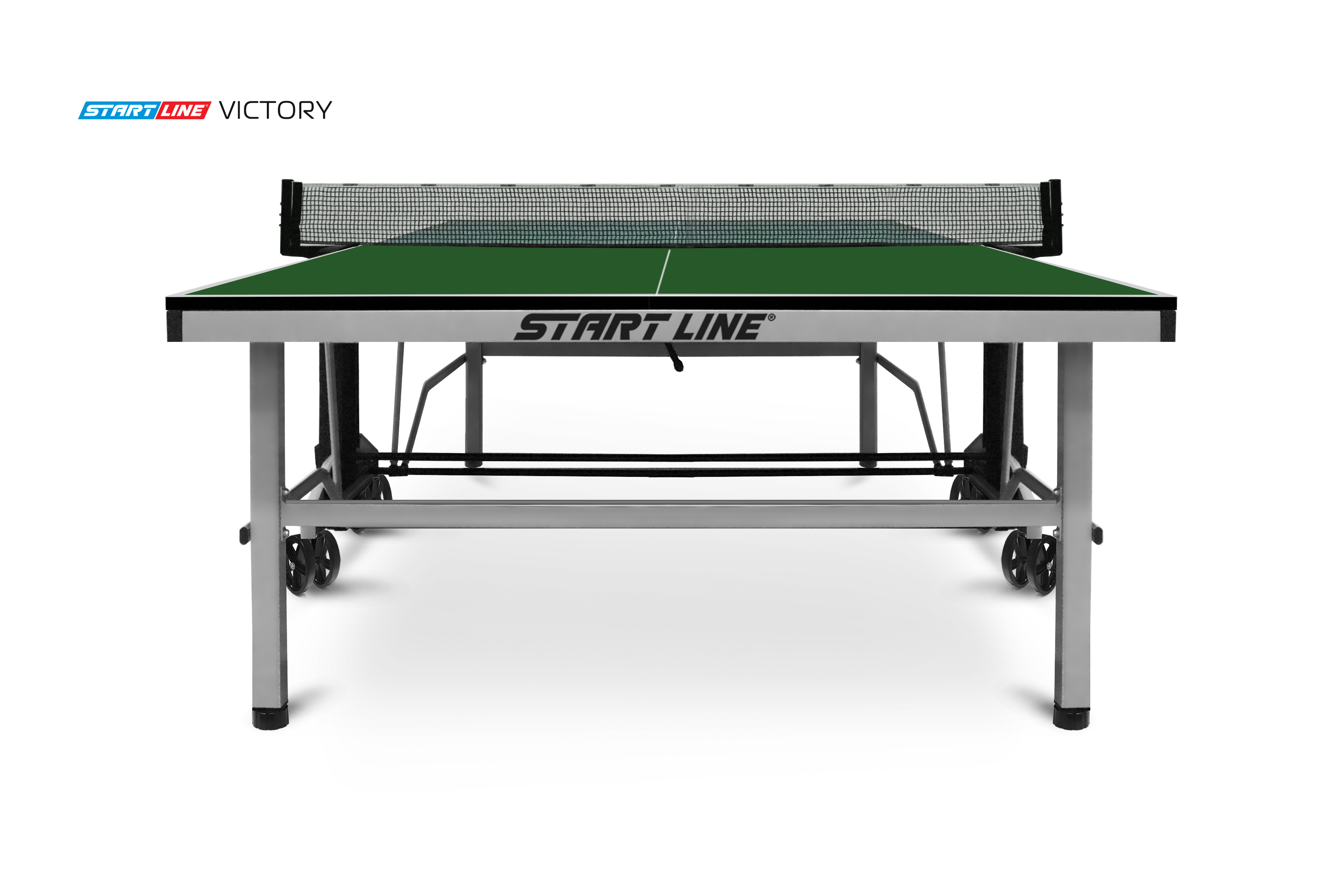 Victory – теннисный стол премиум сегмента для профессиональной игры в помещении.nbsp;nbsp;Высший уровень стиля и качества в мировой индустрии настольного тенниса от российского производителя! Victory разработан на базе последних тенденций при использовании современных методов построения теннисного стола. Наш опыт, наработанный годами, позволил вывести дизайн и качество продукта на высший уровень! Размер стола в рабочем положении: 274 см в длину, 152,5 см в ширину и 76 см в высоту, что соответствует стандарту ITTF. Толщина столешницы из высокопрочного ЛДСП 22 мм обеспечивает равномерный и предсказуемый отскок мяча по всей поверхности. Меламиновое покрытие надежно защищает столешницу от появления трещин и сколов, а кант 50x25 мм и кромка из ПВХ 0,45 мм обеспечивают устойчивость и долговечность стола даже в условиях интенсивной эксплуатации. Монеренные обрезиненные колеса диаметром 125 мм гарантируют легкое и бережное перемещение. Комфортная система складывания стола является собственной авторской разработкой Start Line. Она предусматривает усовершенствованный механизм, позволяющий быстро и надежно закрепить положение стола как в разложенном, так и в сложенном виде. Все манипуляции производятся с рабочего места игрока для каждой из столешниц. С такой системой складывания легко справляется один человек, а стол при хранении занимает минимум пространства. Дополнительная фиксация стола в сложенном виде позволяет просто и безопасно транспортировать стол. Конструкцией предусмотрен режим одиночной игры PLAYBACK для самостоятельной проработки точности ударов. Модель Victory укомплектована удобным держателем для ракеток и мячей с покрытием Soft-touchnbsp;nbsp;и встроенной сеткой с натяжным механизмом, не требующей демонтажа при складывании. Начать игру можно в любое время, ведь все необходимое оборудование всегда под рукой. Victory – профессиональный стол впечатляющего дизайна и совершенных игровых и конструкционных характеристик!
